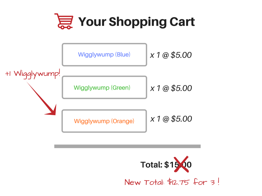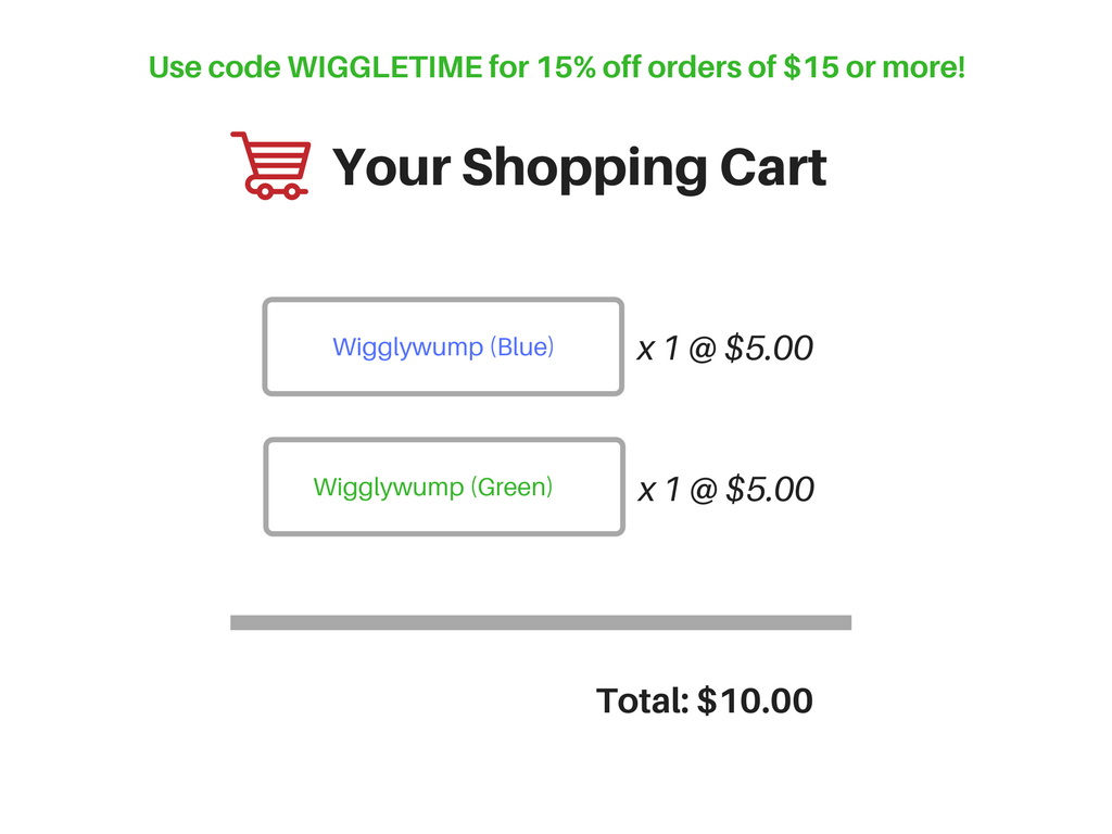 Pretty enticing, eh? And one can never have too many Wigglywumps. So I’ll bump up my cart total to $15, immediately get my discount, and enjoy feeling like a very savvy shopper.